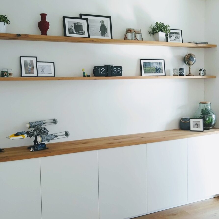 Een zwevende eiken wandplank met blinde plankdragers (onzichtbaar) die op maat wordt gemaakt. Deze sfeervolle muurplank van rustiek eikenhout (brede lamel) is 4 cm dik en heeft diverse rand opties. Configureer uw eiken schap / plank compleet naar wens! Lees meer