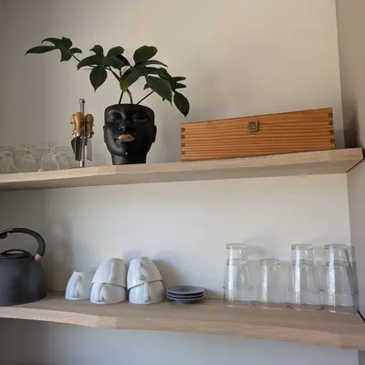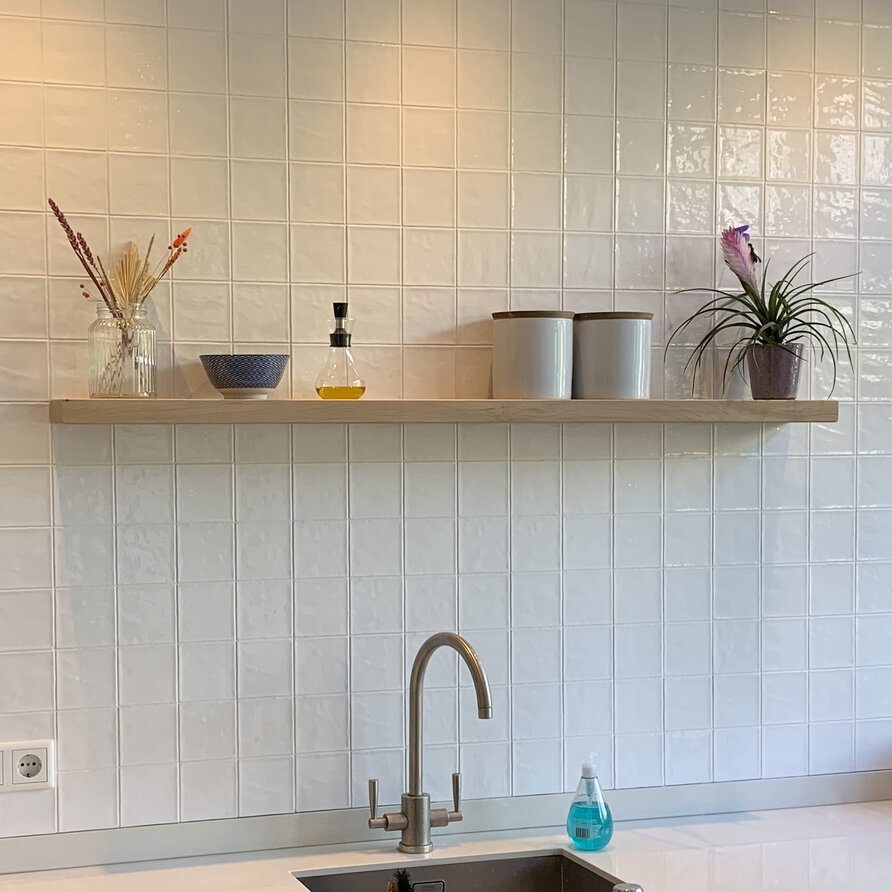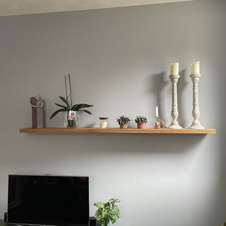 Een zwevende eiken wandplank met blinde plankdragers (onzichtbaar) die op maat wordt gemaakt. Deze stijlvolle muurplank van foutvrij eikenhout (brede lamel) is 2,7 cm dik en heeft diverse rand opties. Configureer uw eiken schap / plank compleet naar wens! Lees meer