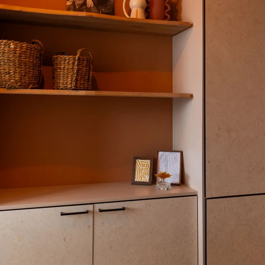 Een zwevende eiken boomstam wandplank met blinde plankdragers (onzichtbaar) op maat. Deze sfeervolle muurplank van rustiek eikenhout (brede lamel) is 2,7 cm dik en heeft een CNC boomstam rand. Configureer uw eiken schap / plank compleet naar wens! Lees meer