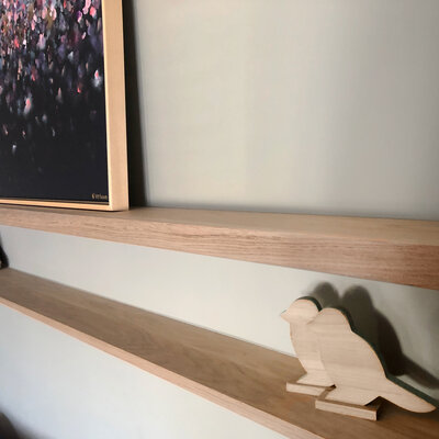 Een zwevende eiken wandplank met blinde plankdragers (onzichtbaar) die op maat wordt gemaakt. Deze stijlvolle muurplank van foutvrij eikenhout is 3 cm dik en heeft diverse rand opties. Configureer uw eiken schap / plank compleet naar wens! Lees meer