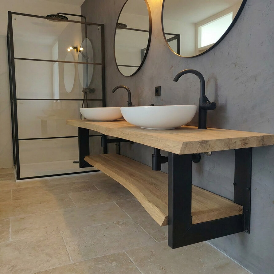 Een eiken boomstam wastafelblad dat op maat wordt gemaakt, inclusief gaten, speciaal voor een waskom / wasbak. Deze stijlvolle "wastafel plank" van foutvrij eikenhout (brede lamel) is 4 cm dik en heeft een CNC boomstam rand. Configureer uw compleet naar w Lees meer