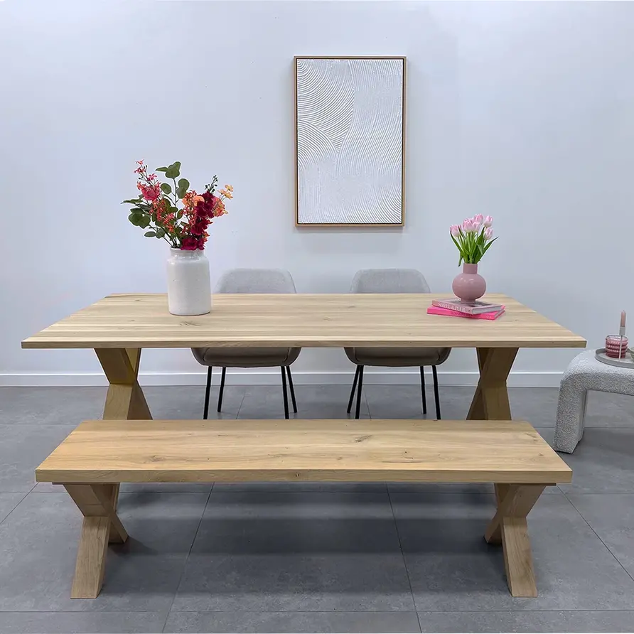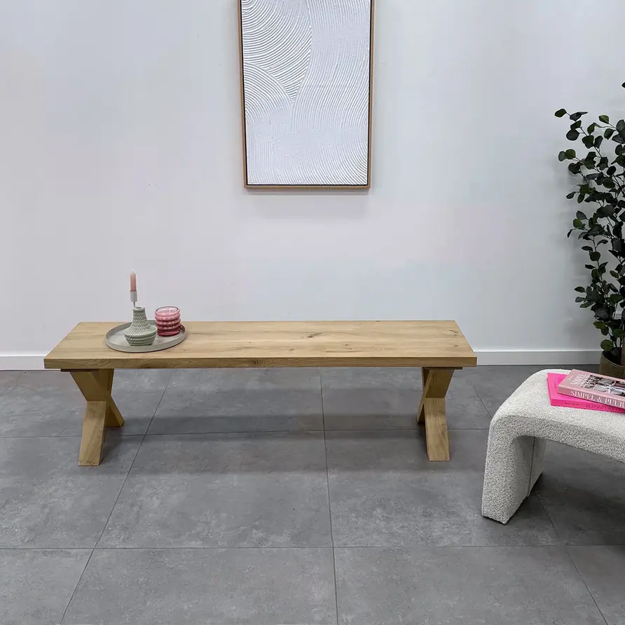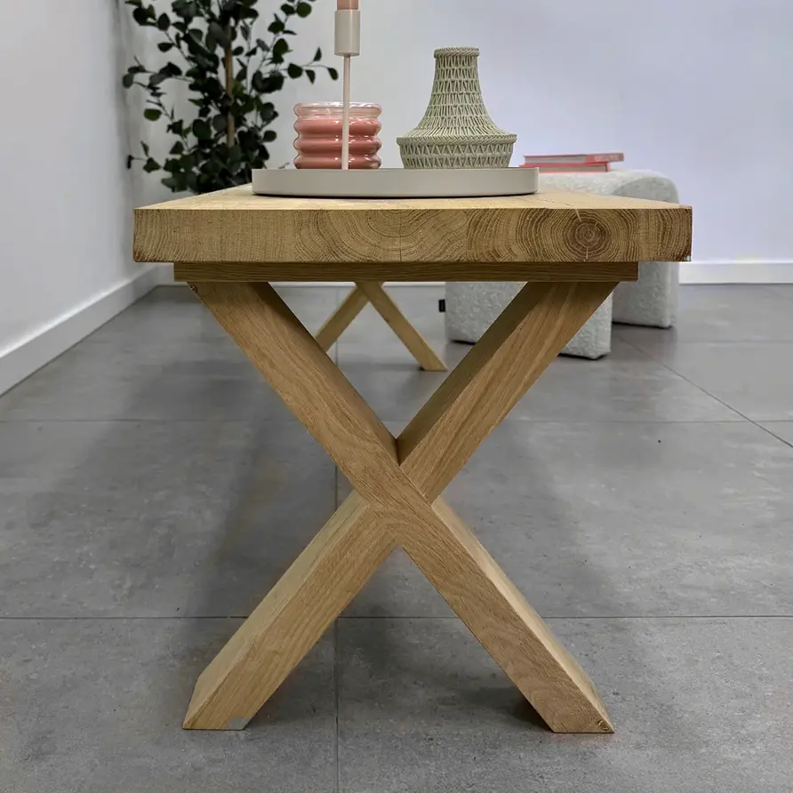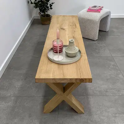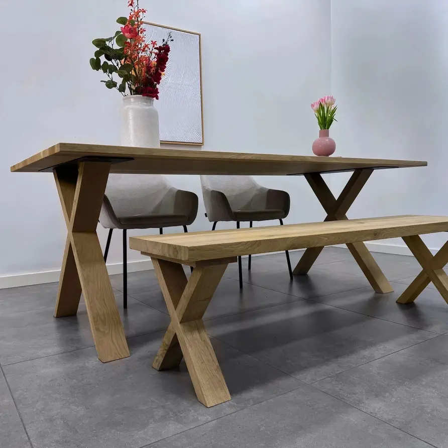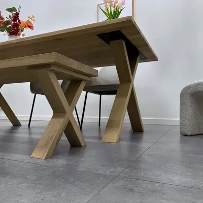 Een eikenhouten X bank poot set van rustiek eikenhout, ideaal voor een trendy eetkamertafel bankje. Deze mooie eiken poot wordt ambachtelijk gemaakt, met veel zorg & aandacht voor detail. De trendy X-vorm, de elegante 8x4 cm "balkmaat" en het warme rustieke eikenhout zorgen voor een prachtige eiken bank poot, erg populair in combinatie met onze eiken (bank)bladen. Het rustieke eikenhout heeft een B-kwaliteit zichtzijde met noesten en scheuren. Dit zorgt voor een levendig en natuurlijk uiterlijk. De poten worden als set van twee stuks geleverd, en de weergegeven prijs is altijd de setprijs.