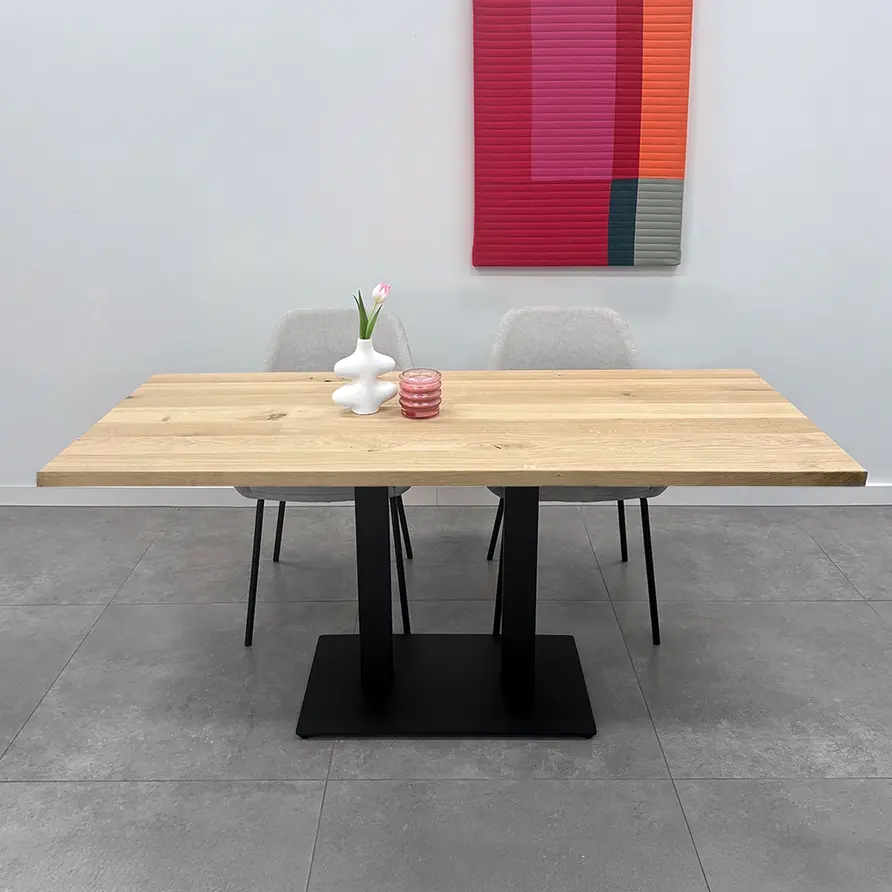 Voor een centraal tafelonderstel adviseren wij een tafelblad van minimaal 2,7 cm dik. Anders dan bij een tafelpoten set wordt het tafelblad niet aan beide uiteinden ondersteund. Dit vergroot de kans op vervorming, met name bij dunnere tafelbladen, ook wanneer het blad voorzien is van staalprofielen.