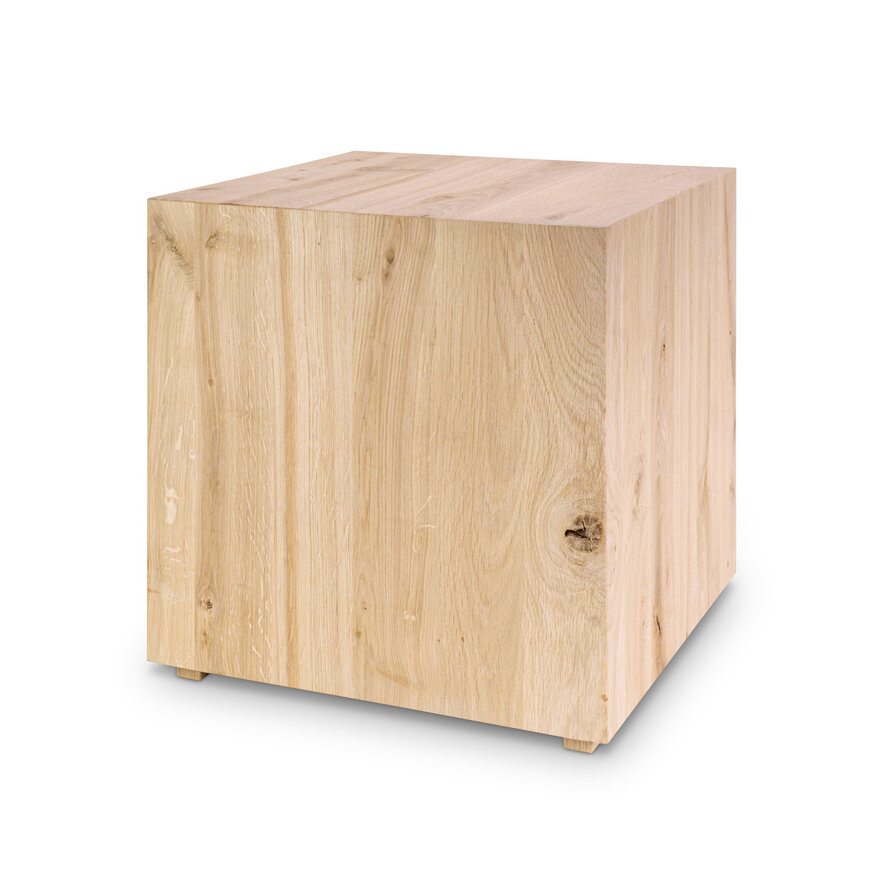 Een strakke kubusvormige salontafel / bijzettafel van sfeervol rustiek eikenhout en 2 cm dik - dat ambachtelijk met de hand op maat wordt gemaakt. Optioneel behandeld, geborsteld en/of verrijdbaar met wieltjes. Configureer naar wens! Lees meer