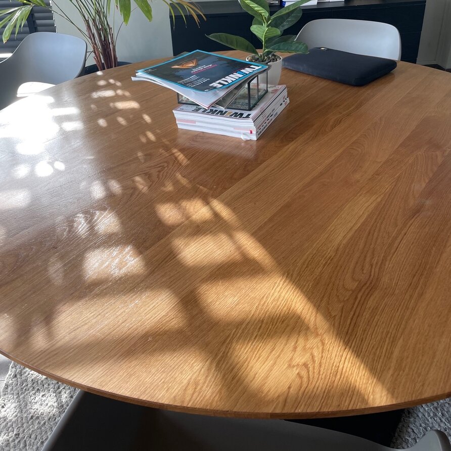 Rond eiken tafelblad - op maat - 4 cm dik (massief) - foutvrij eikenhout (A/B) - smalle lamel - ambachtelijk verlijmde maatwerk tafel - kunstmatig gedroogd (KD) 8-12%. Dit mooie ronde eiken tafelblad van 40 mm dik wordt ambachtelijk met de hand op maat gemaakt, met veel zorg & aandacht voor detail. Een rond eiken tafelblad is stijlvol, gezellig en zeer praktisch voor in kleine(re) ruimtes. Het foutvrije eikenhout heeft een A-kwaliteit zichtzijde, wat betekent dat er praktisch geen noesten en scheuren aanwezig zijn. Dit zorgt voor een stijlvol en elegant uiterlijk.