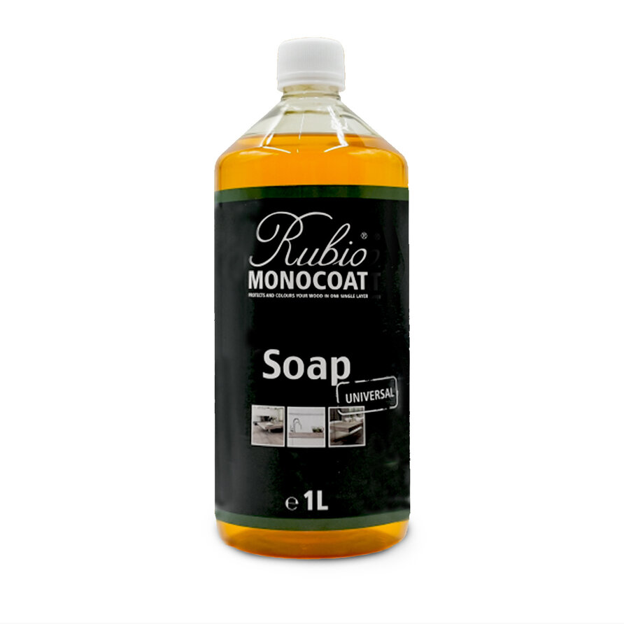 Rubio Monocoat Soap - 1 of 2 liter - voor reiniging en onderhoud van behandelde tafelbladen. Rubio Monocoat Soap is het ultieme reinigingsproduct voor het regelmatig onderhoud van tafelbladen die behandeld zijn met Rubio Monocoat Oil Plus. Rubio Soap is het meest bekende reinigingsmiddel voor met (Rubio) olie behandelde ondergronden. Met Rubio Soap frist u het oppervlak van het tafelblad op en verwijdert u gemakkelijke vuil en vlekken van uw tafelblad. Uw tafelblad blijft mat en behoudt zijn natuurlijke uitstraling! Rubio Soap reinigt beter dan water, en is zeer geschikt voor houten ondergronden.