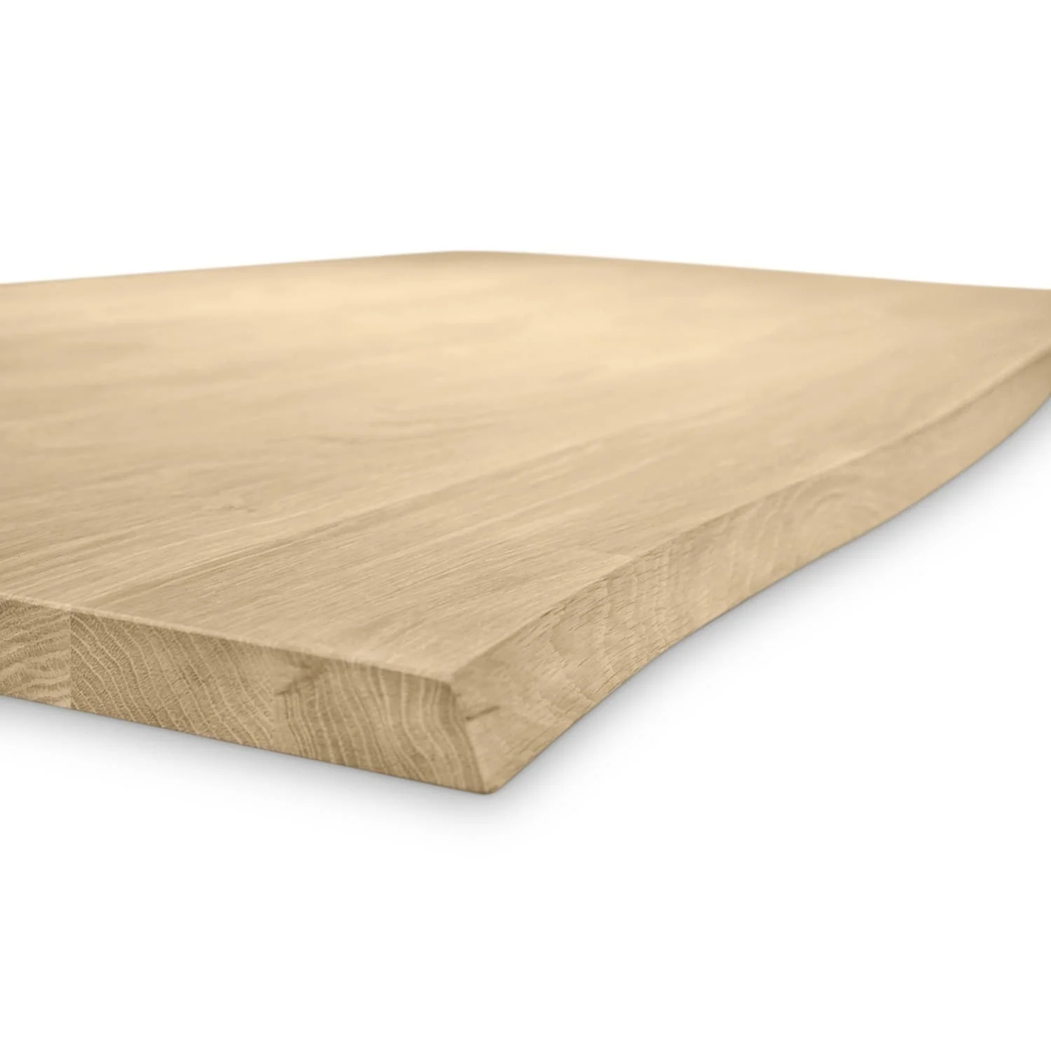 Naast rechte randen (2 mm radius afgerond) kunt u ook kiezen voor een CNC boomstam rand. Een "boomstamrand look" geeft een stoer accent, perfect voor een natuurlijke look. Hierbij wordt - aan de lange voorzijde - een boomstam rand aangebracht (lees: CNC gefreesd). Dus geen "echte" boomstam schorsrand, maar een mooie imitatie hiervan. Het voordeel van deze boomstamrand look is de mooie vormgeving, maar dan wel zonder het opvallende (witachtige) spinthout, die bij een echte boomstam rand zo opvalt. Hierbij worden de randen van de korte zijden afgerond, oftewel "gebroken" met een 2 mm radius vellingkantje / facetrandje.