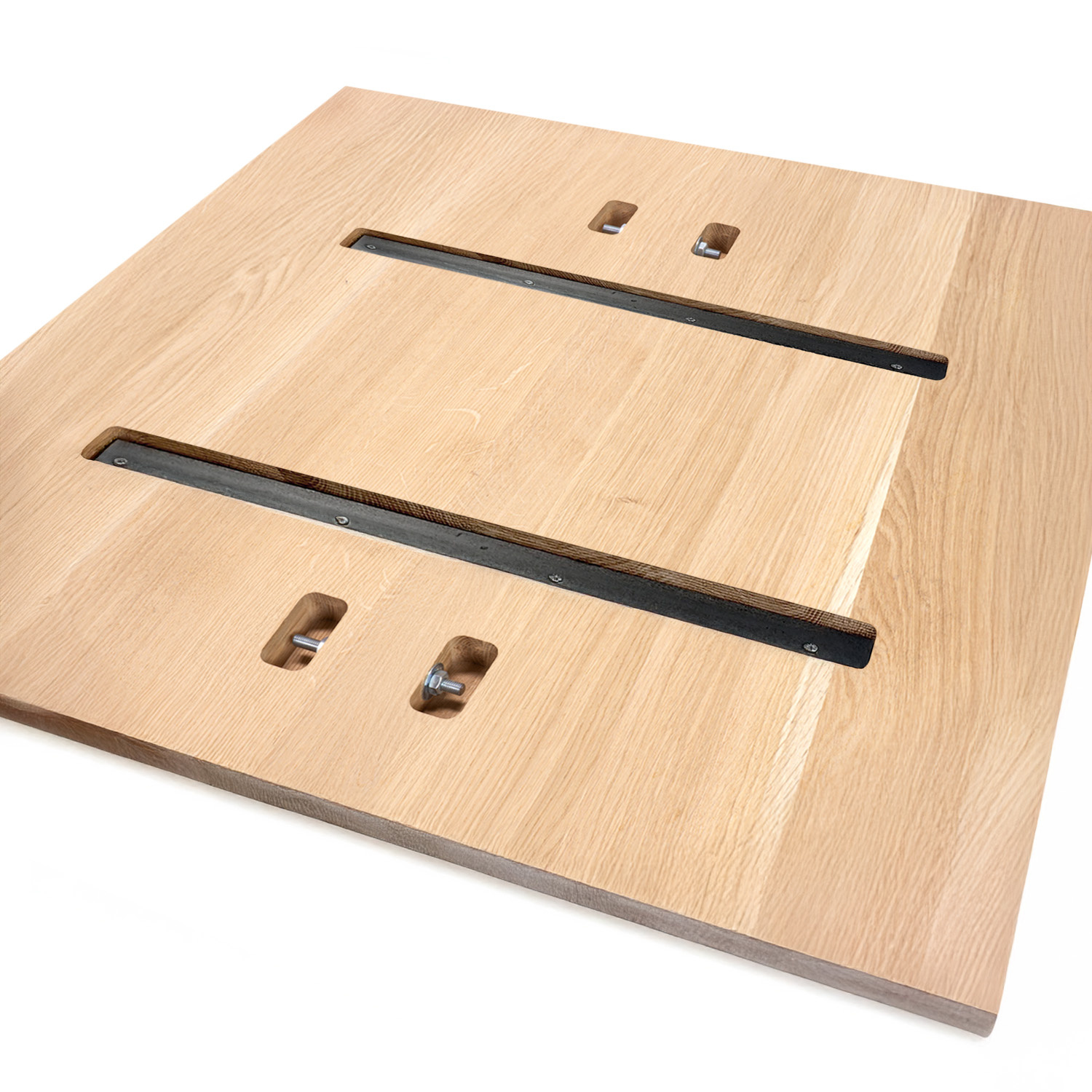 Houd er rekening mee dat de middennaad - de plek waar de twee delen samenkomen - aan de zichtzijde van het tafelblad net iets zichtbaarder kan zijn dan de andere "lamelverbindingen" (binnen het tafelblad). Dit is een natuurlijk gevolg van het (afwijkende) verlijmingsproces.