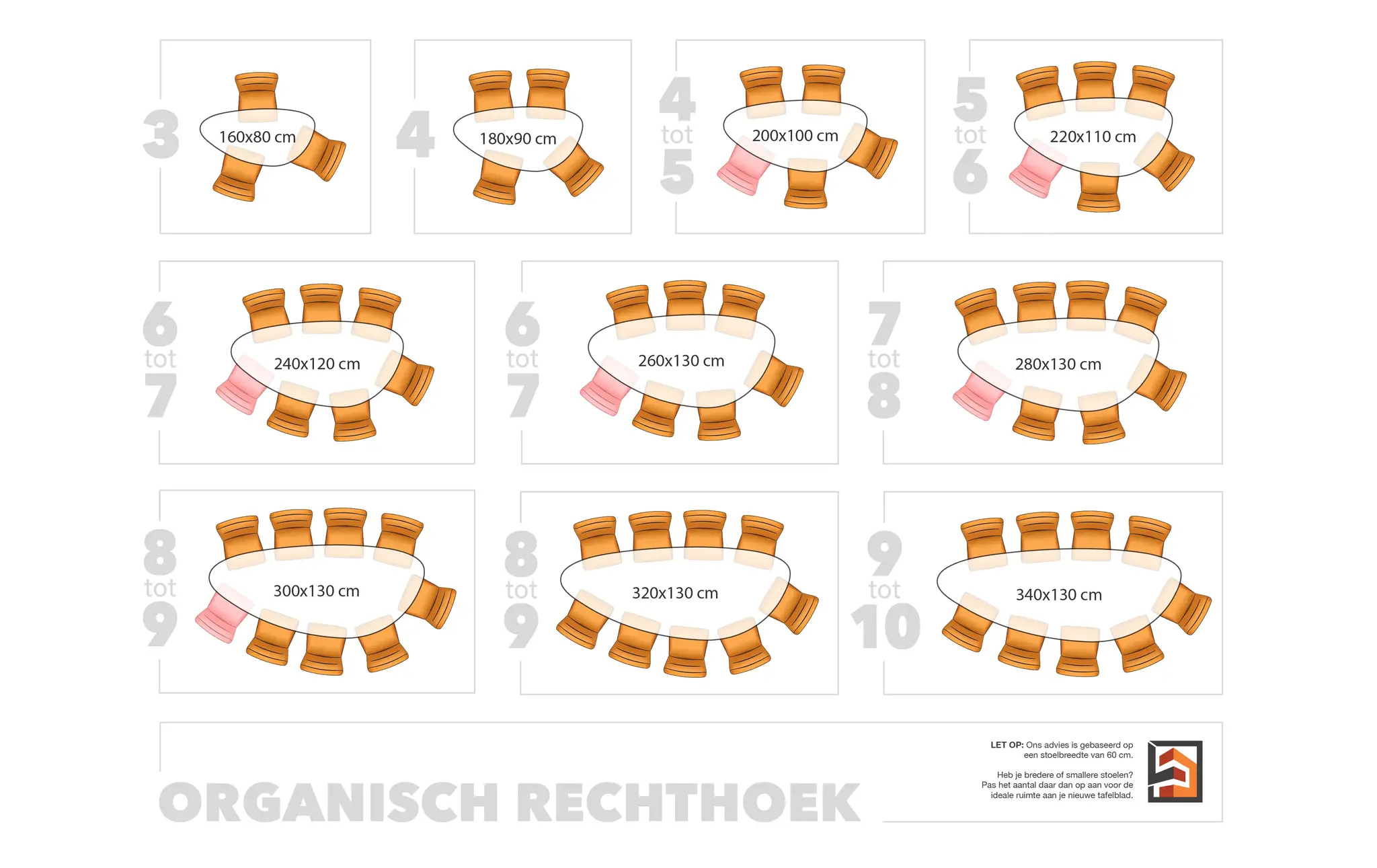 De organische tafel is een bijzondere tafelvorm met een natuurlijke uitstraling. Kenmerkend voor deze vorm is dat één kopse kant vrij vlak en afgerond is, waardoor hier prima een stoel geplaatst kan worden. De andere zijde loopt vaak wat spitser toe, waardoor de beschikbare ruimte voor stoelen hier beperkter is. Vandoor ook de “rode stoelen”. Dit betreft een twijfelgeval: plaatsing is vaak mogelijk, maar houd rekening met beperkte bewegingsruimte en bij (zeer) brede stoelen is de kans groot dat dit niet passend is.