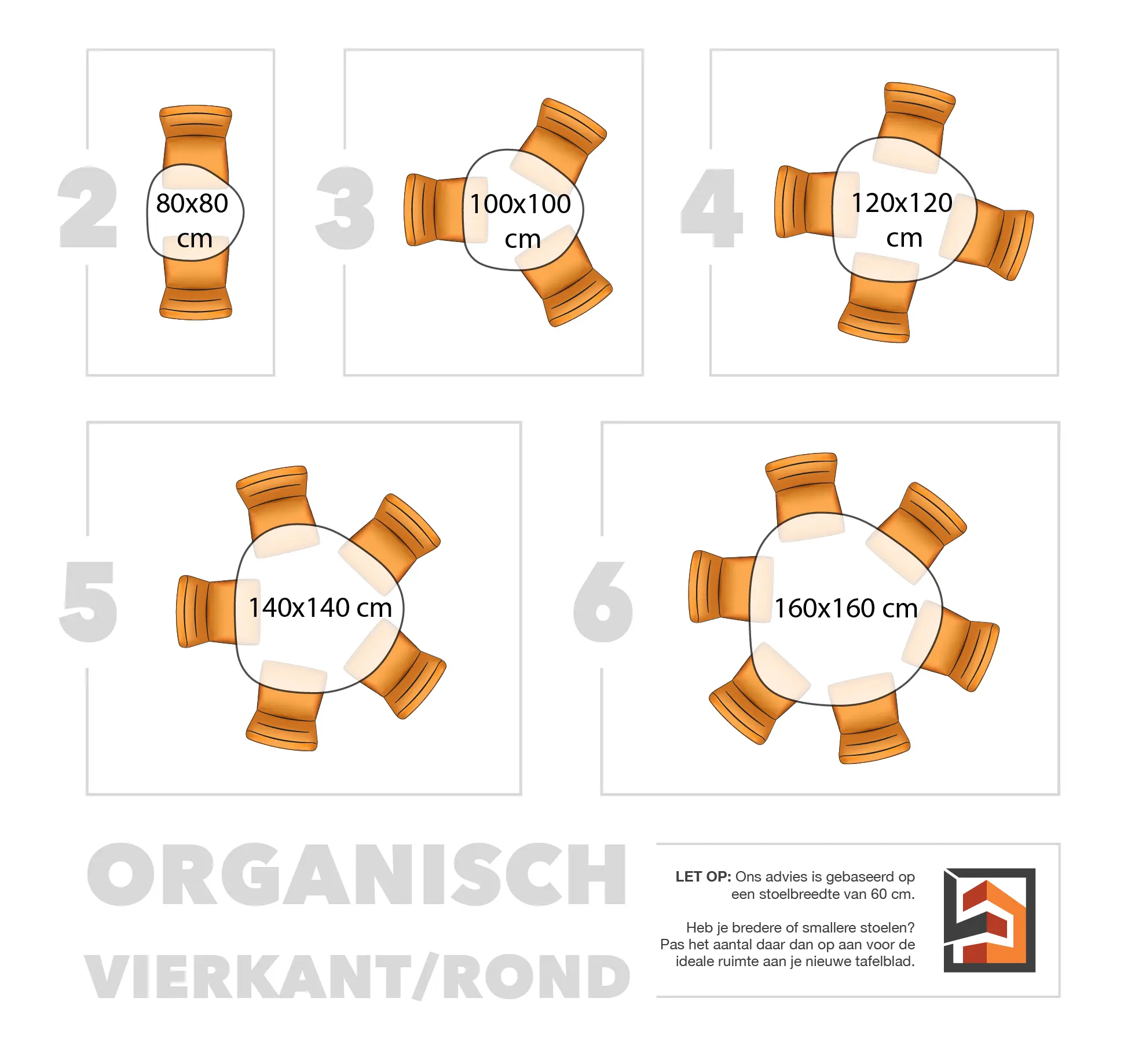 De organische tafel is een bijzondere tafelvorm met een natuurlijke uitstraling die - op het gebied van zitplaatsen - vergelijkbaar is met een ronde tafel. U kunt flexibel omgaan met de plaatsing van stoelen en is er onderling prettig contact aan tafel. Ook hierbij zijn de breedte van de stoel en de ruimte tussen de stoelen van grote invloed op het aantal stoelen dat geplaatst kan worden.