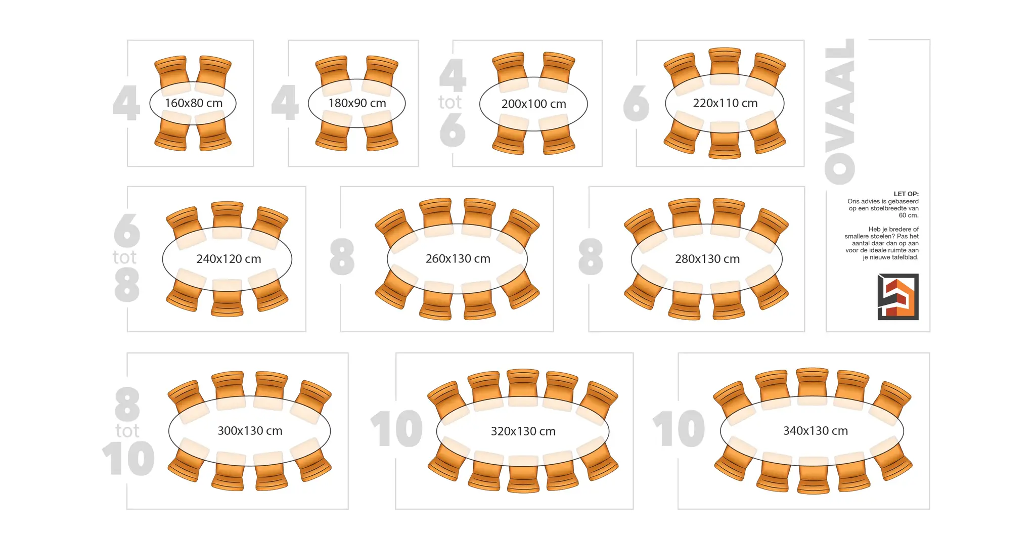 De Deens ovale tafel is een stijlvolle en populaire tafelvorm die de praktische voordelen van een rechthoekige tafel combineert met een moderne look. Dankzij de vrijwel rechte zijden benut u de ruimte efficiënt en creëert u eenvoudig extra zitplaatsen. De afgeronde uiteinden hebben nauwelijks invloed op het aantal stoelen en aan de kopse kanten kan prima een stoel worden. Wij hanteren een minimale breedte van 80 cm voor het plaatsen van een stoel aan de kopse kant.