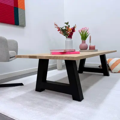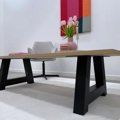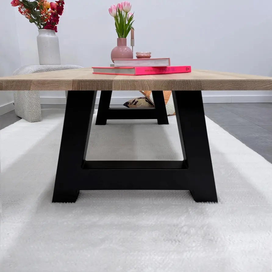 Een zwarte A salontafelpoot van stevig staal, ideaal voor een mooie salontafel! Deze mooie salon tafelpoot van staal wordt ambachtelijk gemaakt (gelast) en voorzien van een hoogwaardige poedercoating. De sfeervolle A-poten vorm, de robuuste 8x8 cm "kokermaat" en de stoere (mat)zwarte fijnstructuur coating zorgen voor een prachtige zwarte salon tafelpoot, erg populair in combinatie met onze eiken tafelbladen. De poten worden als set van twee stuks geleverd, en de weergegeven prijs is altijd de setprijs.