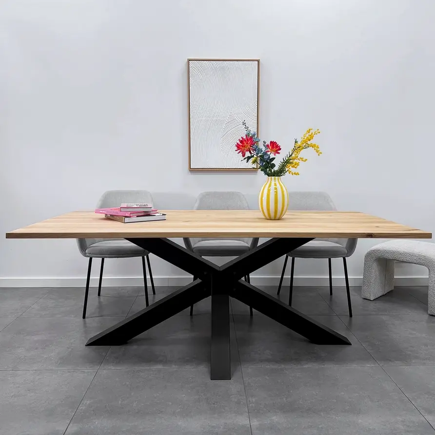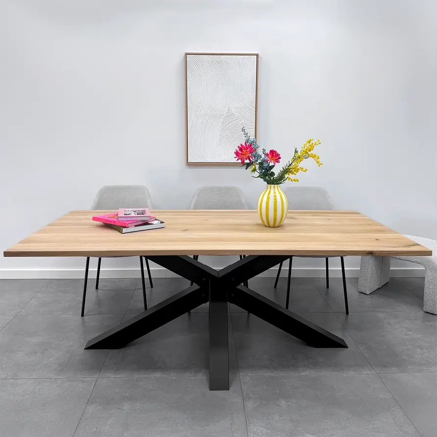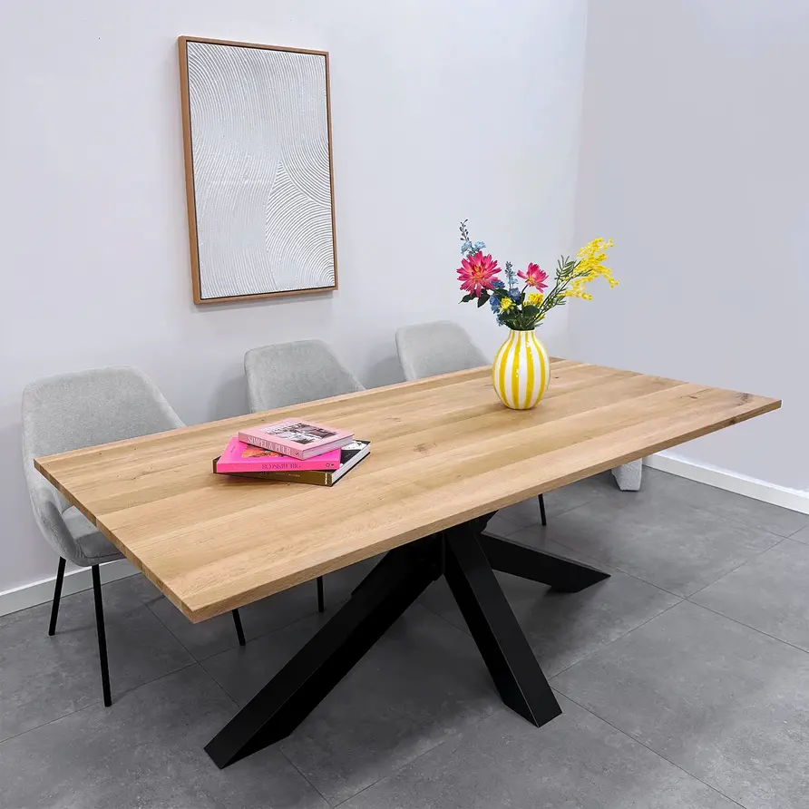 Voor een centraal tafelonderstel adviseren wij een tafelblad van minimaal 2,7 cm dik, vooral bij grotere tafels (langer dan 200 cm). Anders dan bij een tafelpoten set wordt het tafelblad niet aan beide uiteinden ondersteund. Dit vergroot de kans op vervorming, met name bij dunnere tafelbladen, ook wanneer het blad voorzien is van staalprofielen.