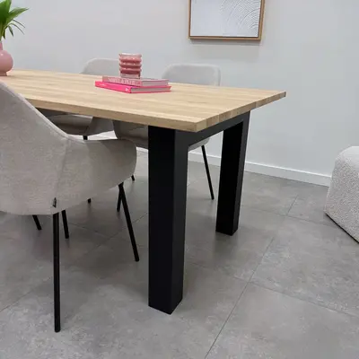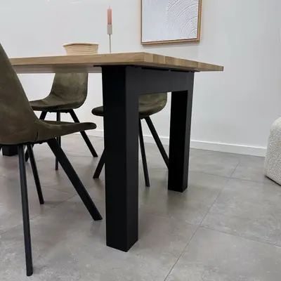 Een zwarte N poot van stevig staal, ideaal voor een mooie (eet)tafel! Deze mooie stalen tafelpoot wordt ambachtelijk gemaakt (gelast) en voorzien van een hoogwaardige poedercoating. De toegankelijke N-tafelpoot vorm, de robuuste 10x10 cm "kokermaat" en de stoere (mat)zwarte fijnstructuur coating zorgen voor een prachtige zwarte tafelpoot, erg populair in combinatie met onze eiken tafelbladen. De poten worden als set van twee stuks geleverd, en de weergegeven prijs is altijd de setprijs.