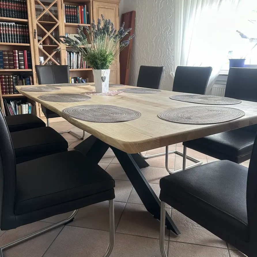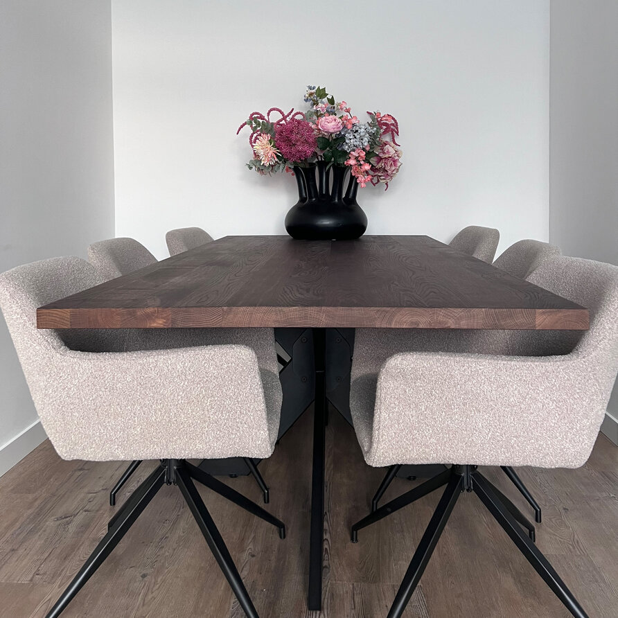 Voor een centraal tafelonderstel adviseren wij een tafelblad van minimaal 2,7 cm dik, vooral bij grotere tafels (langer dan 200 cm). Anders dan bij een tafelpoten set wordt het tafelblad niet aan beide uiteinden ondersteund. Dit vergroot de kans op vervorming, met name bij dunnere tafelbladen, ook wanneer het blad voorzien is van staalprofielen.