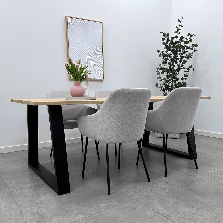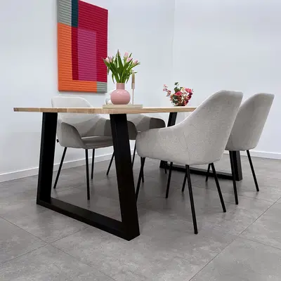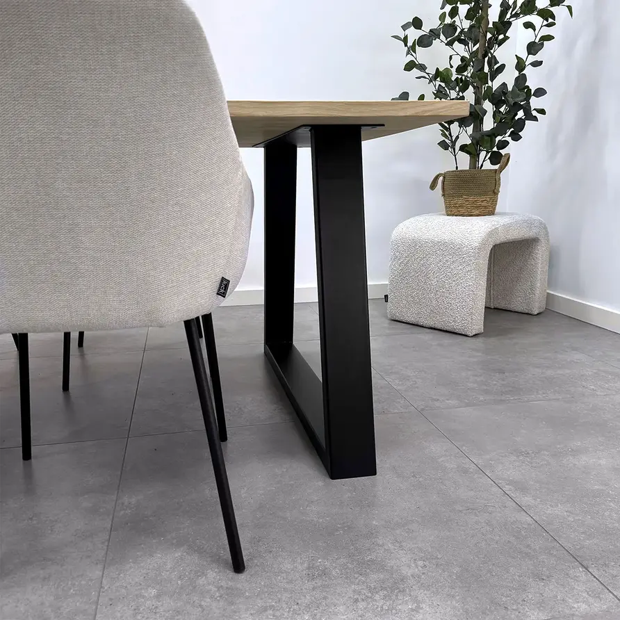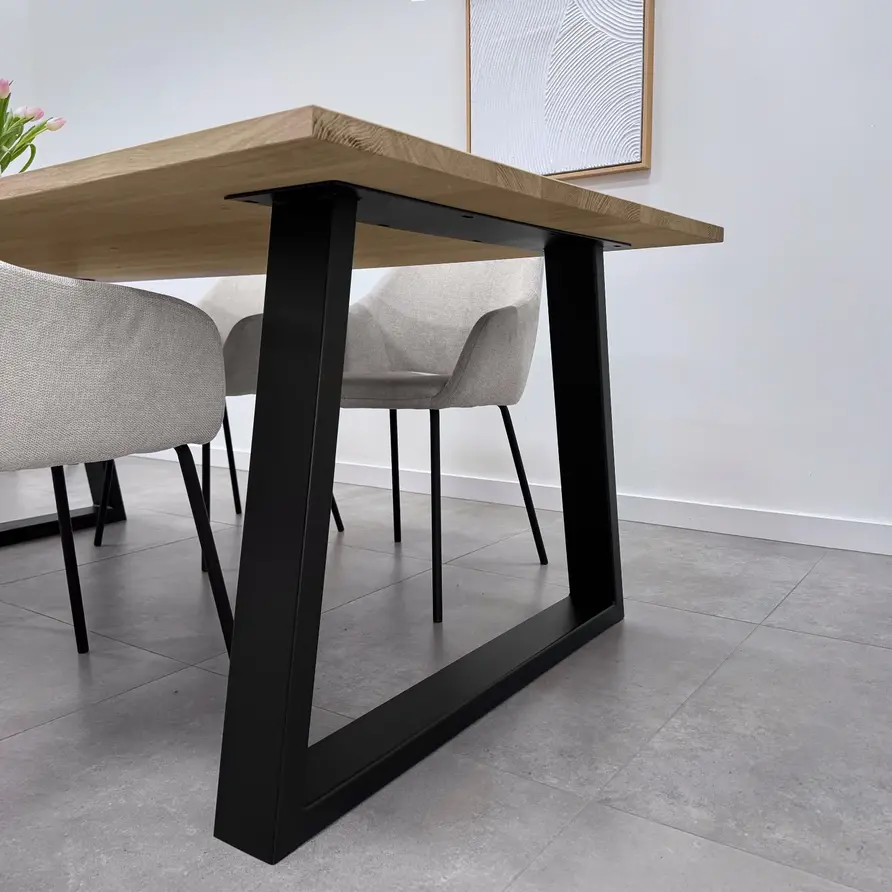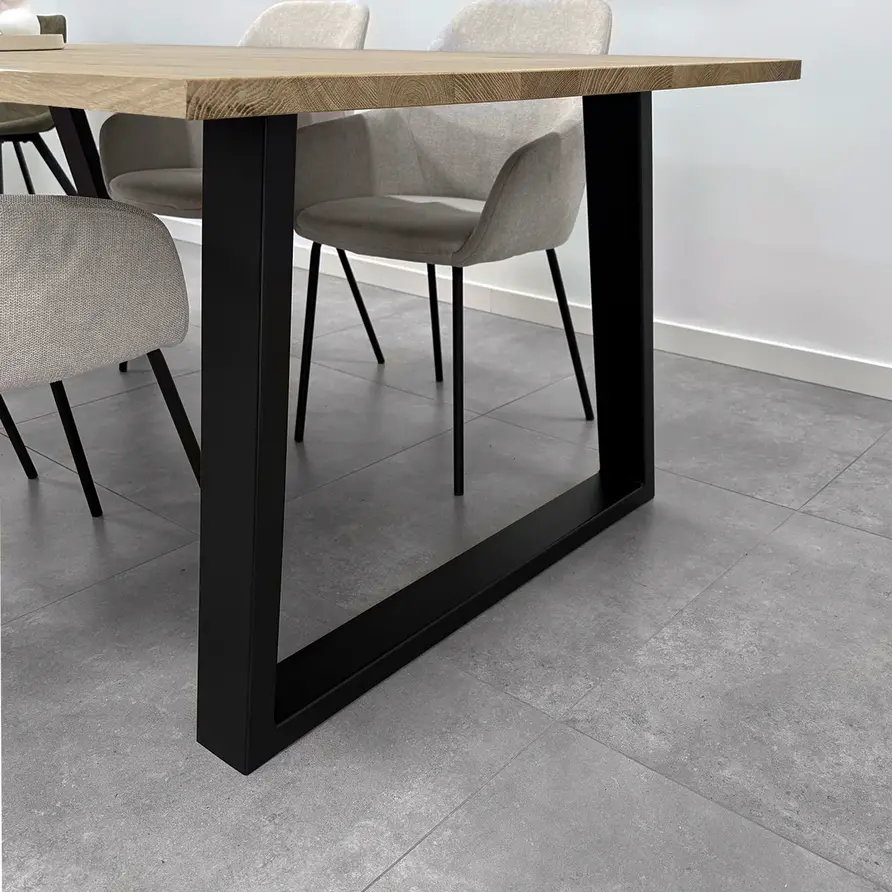Een zwarte trapeze poot van stevig staal, ideaal voor een mooie (eet)tafel! Deze mooie stalen tafelpoot wordt ambachtelijk gemaakt (gelast) en voorzien van een hoogwaardige poedercoating. De eigentijdse trapezium poot vorm, de elegante 4x10 cm "kokermaat" en de stoere (mat)zwarte fijnstructuur coating zorgen voor een prachtige zwarte tafelpoot, erg populair in combinatie met onze eikenhout tafelbladen. De poten worden als set van twee stuks geleverd, en de weergegeven prijs is altijd de setprijs.