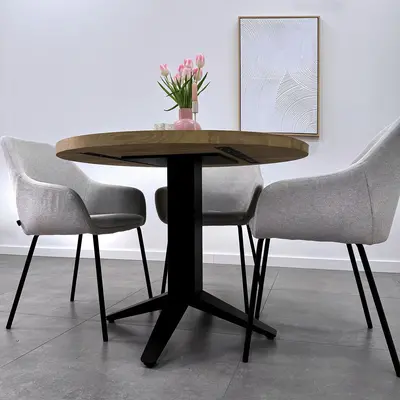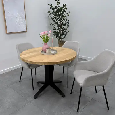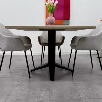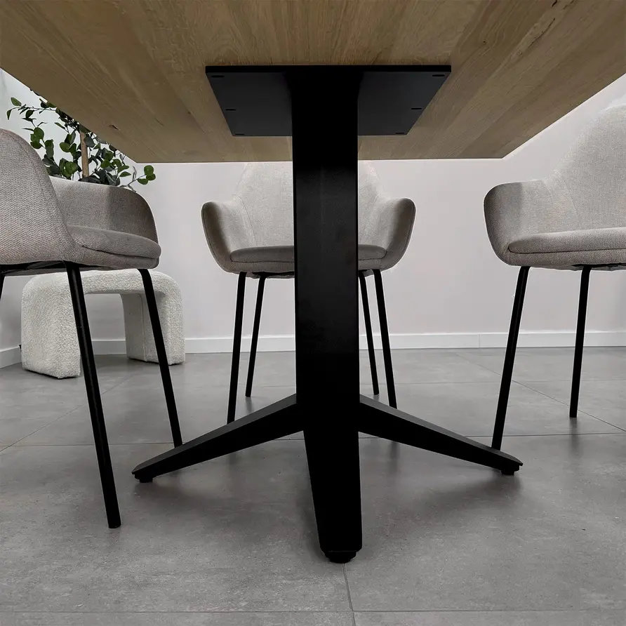 Voor een centraal tafelonderstel adviseren wij een tafelblad van minimaal 2,7 cm dik. Anders dan bij een tafelpoten set wordt het tafelblad niet aan beide uiteinden ondersteund. Dit vergroot de kans op vervorming, met name bij dunnere tafelbladen, ook wanneer het blad voorzien is van een staalprofiel.