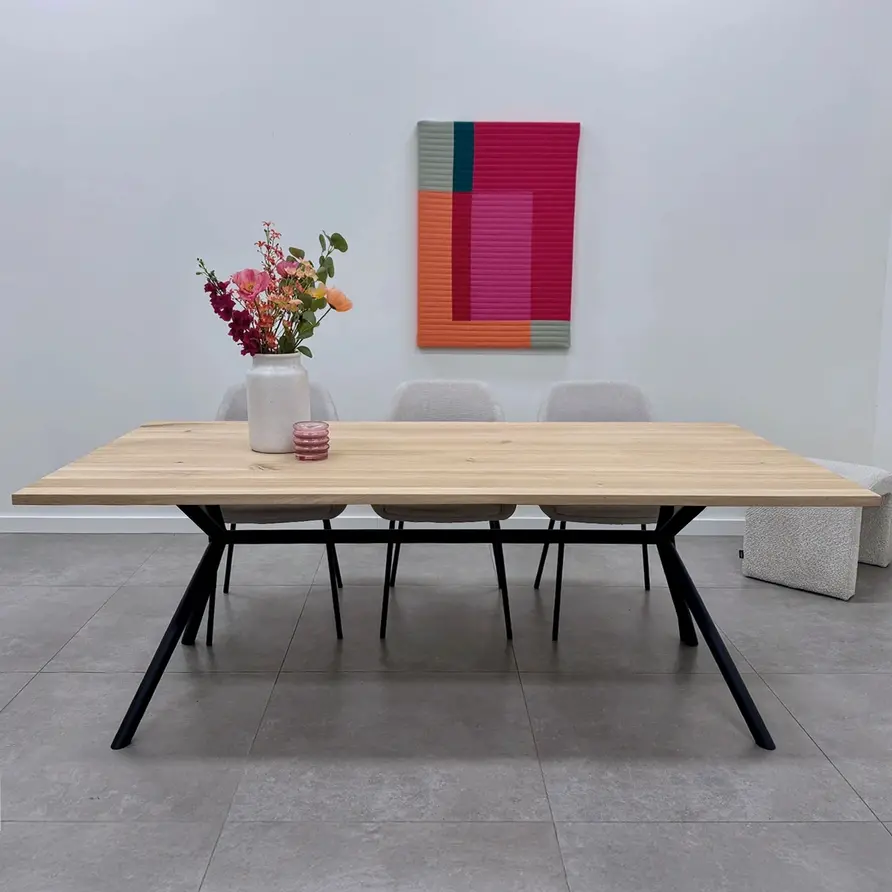 Een zwart X-frame tafelonderstel van stevig staal, ideaal voor een mooie (eet)tafel! Dit mooie ronde stalen tafel onderstel wordt ambachtelijk gemaakt (gelast) en voorzien van een hoogwaardige poedercoating. De trendy X-vorm, de elegante ronde buis met een diameter van 4,2 cm en de stoere (mat)zwarte fijnstructuur coating zorgen voor een prachtig zwart tafel onderstel, erg populair in combinatie met onze eiken tafelbladen. De "x-poten" zijn voorzien van een "knik", die zorgt voor extra diepte en een luxe uitstraling!