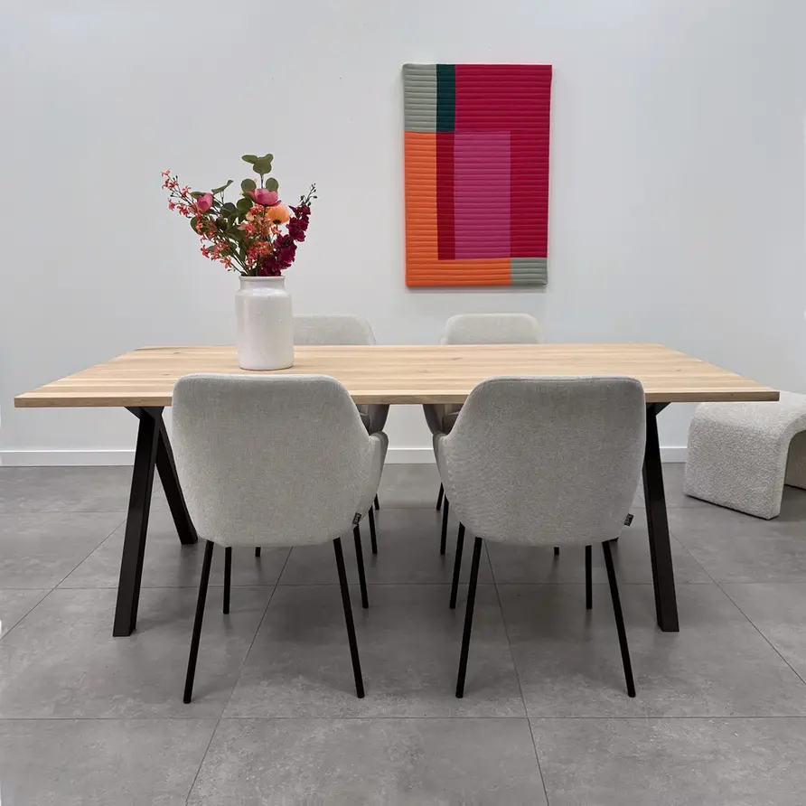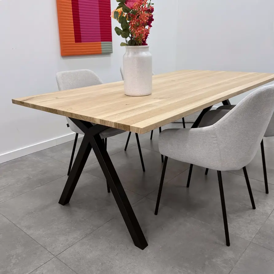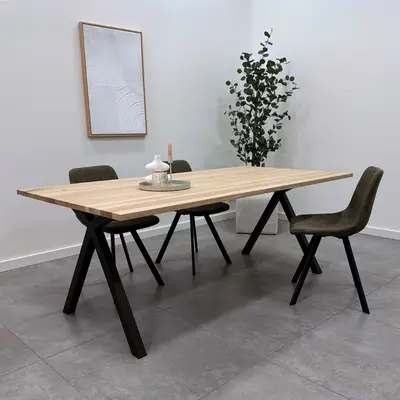 Een zwarte scissor poot van stevig staal, ideaal voor een mooie (eet)tafel! Deze mooie stalen eettafelpoot wordt ambachtelijk gemaakt (gelast) en voorzien van een hoogwaardige poedercoating. De aparte "schaar" vorm, de toegankelijke 5x5 cm "kokermaat" en de stoere (mat)zwarte fijnstructuur coating zorgen voor een prachtige zwarte tafelpoot, erg populair in combinatie met onze eiken tafelbladen. De poten worden als set van twee stuks geleverd, en de weergegeven prijs is altijd de setprijs.